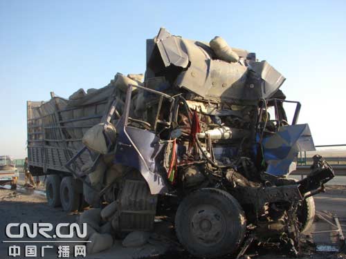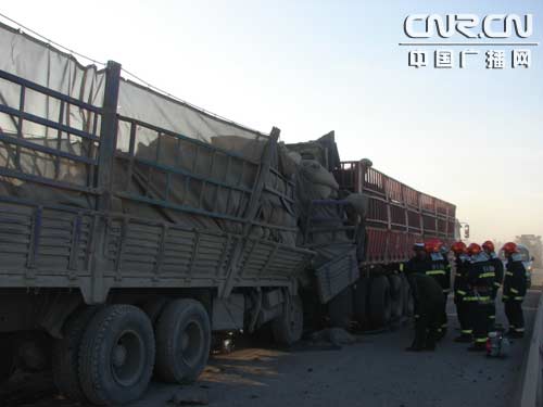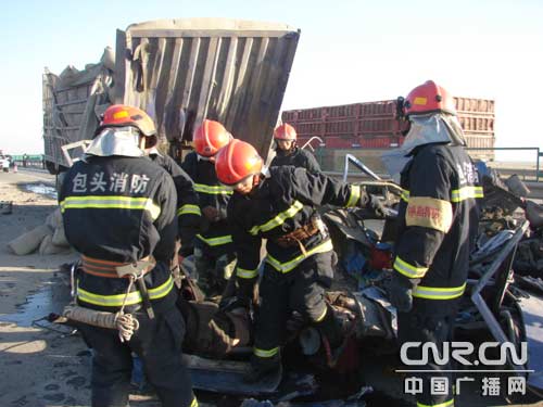 包頭消防支隊接到報警后,派出8名特勤官兵和一輛多功能救援車于7:32到達事故現場,采取交通限行、緊急搶救等措施,將追尾的兩輛貨車分開。但由于追尾車輛車廂嚴重受損變形,導致5名駕乘人員全部當場死亡。