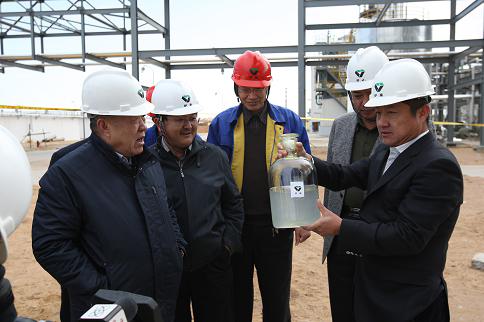 伊泰集團總經理張東海拿到手的這桶油,是我國完全自主知識產權的第一桶煤制油品。 韓雄亮 攝影