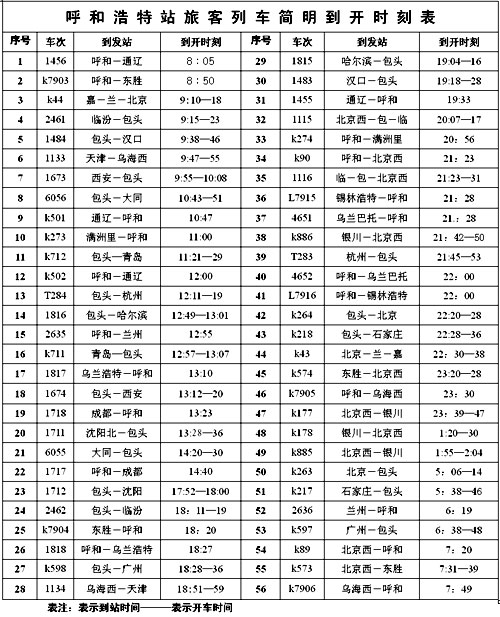 在原運行圖的基礎上,有38趟列車的運行時刻、車次等發生變化,其中原圖呼和—東勝的N293次,調圖后車次變更為K7903/4次;原圖包頭—北京西的1186次,調圖后車次變更為K886/5次,運行區間延長為:銀川—北京西;原圖呼和—烏海西的N281次,調圖后車次變更為K7905/6次。包頭—海拉爾隔日運行哈爾濱的1816次列車,終到站調整為哈爾濱,不再運行至海拉爾,運行時刻比舊運行圖推后2小時56分鐘,到達呼和時間:12:49,開車時間:13:01,停站時間延長4分鐘,終到哈爾濱時間:14:57分,沿途停靠正鑲白旗、桑根達萊、林西、大板、通遼、四平、長春、德惠等站。K598次列車運行時刻比原時刻提前44分鐘到達呼和站,停站時間縮短4分鐘。