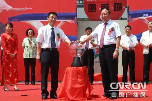 內(nèi)蒙古自治區(qū)副主席劉新樂(前右)與國家體育總局乒羽中心副主任于斌啟動倒計時計時器。(攝影/馬立峰)