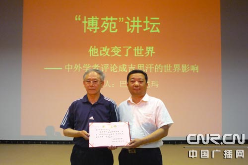 內蒙古博物院授予巴拉吉尼瑪“民族文化弘揚者”榮譽稱號(攝影 王芳) 中廣網呼和浩特6月22日消息 (記者鄭穎 實習記者王芳)近日,內蒙古博物院“博苑”講壇第一期觀眾講座開講。此次講座邀請內蒙古北方民族文化遺產研究會會長、多年研究成吉思汗并著有《千年風云第一人——世界名人眼中的成吉思汗》一書的作者巴拉吉尼瑪為觀眾開辦《他改變了世界——中外學者評論成吉思汗的世界影響》講座。