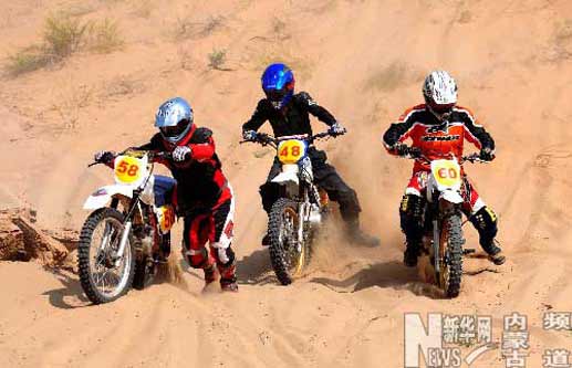 |  7月29日,幾名參賽選手在沙漠里艱難騎行。 中廣網呼和浩特7月30日消息 首屆內蒙古自治區環冬青湖摩托車賽29日在內蒙古磴口縣烏蘭布和沙漠深處的冬青湖旅游度假村舉行,來自天津、山西、陜西、寧夏、內蒙古等8個省區市的22個代表隊、近80名選手參加了比賽。