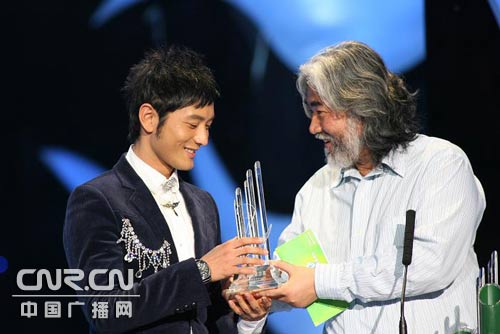 著名制作人張紀中為年度最受大學生喜愛新人獎歌手黃曉明頒獎