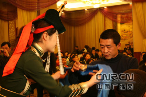 飯店工作人員用蒙古族最高禮向外來務工人員敬酒