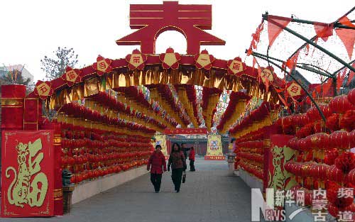 2月19日,游園的市民從呼和浩特市五塔寺元宵燈會入口走過。 元宵節臨近,呼和浩特各社區、街道辦事處組織了元宵節燈會等各種形式的游園活動。(張領)