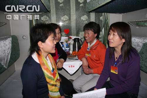 中廣網呼和浩特3月3日消息(記者鄭穎) 3月2號晚,參加第十一屆全國人大一次會議的內蒙古代表團代表乘坐火車進京;疖噭傄粏樱谝粋臥鋪包廂的四位女代表就聊起了各自帶的議案、建議。