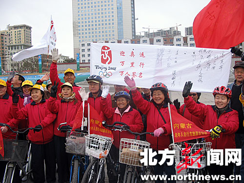 中廣網呼和浩特3月13日消息 3月12日8時30分,內蒙古老年人自行車旅游者協會在呼和浩特市新華廣場舉辦活動,為騎行萬里赴云南省昆明市的100名老年人送行。百名老人沿途將為此次“為奧運喝彩萬里行”活動征集萬人簽名,萬人簽名旗將在奧運會開幕前送到北京奧組委。