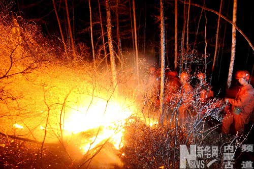 武警內(nèi)蒙古大興安嶺森林支隊官兵在撲火前線(4月20日攝) 新華社記者張領攝