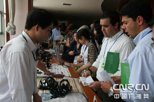 進入會場前,與會人員領取翻譯耳機,并登記所需語言
