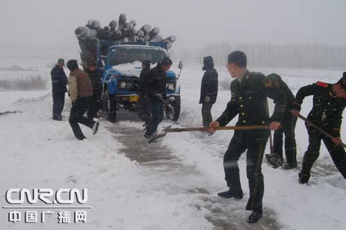 接此消息后,室韋邊檢站執(zhí)勤官兵來不及添加任何防寒衣物就立即拿起清雪工具,迅速趕往車輛受困地點(diǎn)幫助清理道路積雪。由于積雪較厚且降雪一直未停,加之此段坡路較長(zhǎng),官兵在零下10攝氏度的低溫環(huán)境下,克服了手中工具簡(jiǎn)易帶來的不便,發(fā)揚(yáng)部隊(duì)不怕苦、不怕累的優(yōu)良作風(fēng),堅(jiān)持奮戰(zhàn)近兩個(gè)小時(shí),將長(zhǎng)約500米的道路徹底清理完畢,車輛得以繼續(xù)通行。司機(jī)張某緊緊握著執(zhí)勤官兵的手,激動(dòng)地說:“邊檢官兵在關(guān)鍵時(shí)刻總能挺身而出,為我們排憂解難,真不愧是人民的子弟兵,太謝謝你們了!”