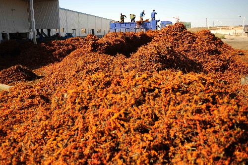 10月30日,農民正在東勝區一家沙棘生產企業交售沙棘果。 內蒙古鄂爾多斯是我國重要的沙棘產地,沙棘保存面積達300多萬畝,約占全國沙棘總面積的70%。近年來,鄂爾多斯市引進幾家大型沙棘加工企業,使沙棘在發揮生態效益的同時也產生了很大的經濟效益,項目區內農民每年從沙棘種植、管護、摘果等方面人均增加收入近千元。