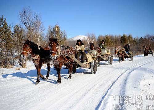 在呼倫貝爾烏奴爾林業局新林林場,幾位群眾趕著馬車上山(攝于12月1日)。 每年10月中下旬開始,內蒙古自治區呼倫貝爾市就會出現千里冰封,萬里雪飄的景象。長達5個多月的冬季積雪期,讓這里的草原、森林、山川和河流展現出獨特的冰雪畫卷。 新華社記者 任軍川攝