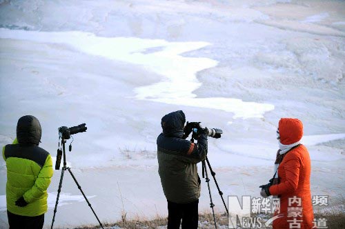 12月27日,旅游者在內蒙古克什克騰旗西拉沐倫河積雪的冰面上等待拍攝。從12月27日至29日,內蒙古自治區出現2008年入冬以來最大范圍的降雪天氣。全區自西向東大部分地區陸續降雪普遍在5毫米左右。 新華社記者 張領 攝