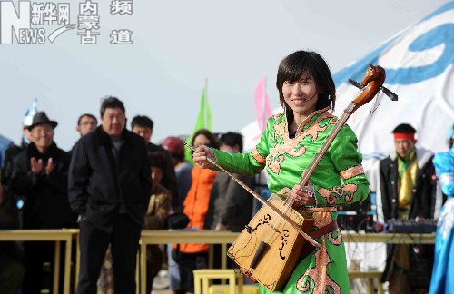 一名烏拉特后旗烏蘭牧騎的隊員在潮格溫都爾鎮(zhèn)查干敖包嘎查為農(nóng)牧民演奏馬頭琴(2月7日攝)。 元宵節(jié)前夕,內(nèi)蒙古各地烏蘭牧騎隊員冒著嚴寒深入到基層農(nóng)村牧區(qū),為各族群眾表演民樂、歌舞節(jié)目。 張領(lǐng) 攝