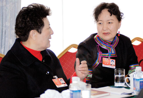 3月4日,全國政協委員德德瑪(左)與內蒙古全國政協委員杜梅在民族組分組討論會上交流。 記者 袁永紅 攝