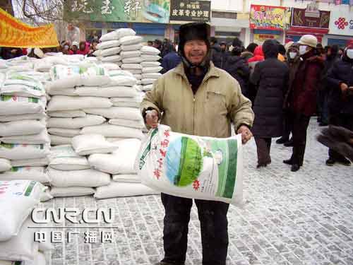 絲綢廠下崗職工宗聯元領到面粉很高興