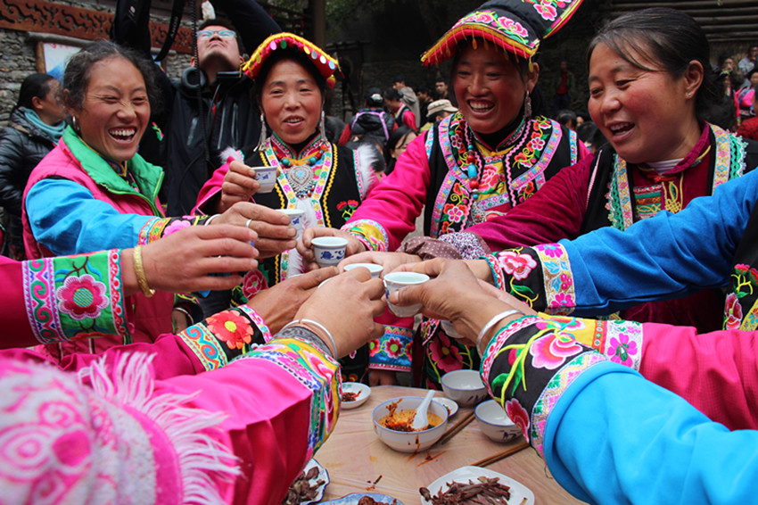 羌族群眾舉起節(jié)日的酒杯