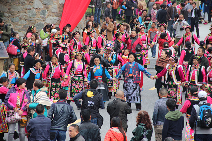 在四川省汶川縣,隨著“羌年”的到來,汶川各地沉浸在喜迎“羌年”的濃濃氛圍中,“咚咚咚”的羊皮鼓聲響了起來,熱情的羌族鍋莊也跳了起來,甘甜的咂酒喝了起來。一大早,汶川縣水磨鎮(zhèn)的男女老少便身著節(jié)日的盛裝,早早地匯聚到水磨羌城,載歌載舞,歡度羌?xì)v新年。在汶川縣龍溪鄉(xiāng)東門寨前,來自龍溪鄉(xiāng)各村的羌族同胞身穿節(jié)日的盛裝,和游客齊聚寨門前,在釋比老人主持的砸酒開壇儀式和新年祝福聲中舉行開寨儀式,喜慶羌年的到來。中午,龍溪鄉(xiāng)聯(lián)合村羌戲樓前的空地上擺起了千人壩壩宴,來自成都、重慶等地的游客與當(dāng)?shù)厍甲迦罕娨黄鸪鹆饲甲寰聘瑁蠡锸峙踉揖疲瑧c羌年。