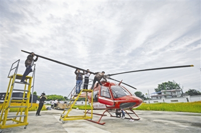 昨晨9點,成都商報記者在四川省旅游學院黃龍溪校區看到了整裝待發的救援隊伍,以及一架鮮紅色的直升機和一架白色直升機。“紅色的機型是貝爾407GXP,馬上趕到災區。白色的機型是羅賓遜R44,在成都待命。”楊毅說。 受飛行條件限制,貝爾407GXP奔赴災區必須走陸路。在成都完成4片旋翼的拆卸后,這個紅色的大家伙被固定在一輛大掛車上,經過8小時的“長途托運”,終于在昨晚7點抵達了茂縣疊溪鎮排山營村小寨組的一片三四百平方米的平地,這是距新磨村受災核心區最近又最適宜起落的點位。楊毅說,26日早上9時,在飛行條件允許的情況下,貝爾407GXP會從這塊平地上起飛,直抵新磨村受災核心區。“我們會運送兩名國土資源部的地質專家,到相對高度300米左右的上空勘測山體上方地質,預測衍生災害發生的可能性。”