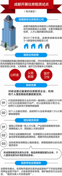 稅收優惠方面,成都將對依法登記備案的住房租賃企業、機構和個人落實稅收優惠政策支持。對包括房屋租賃企業在內的一般納稅人出租在2016年4月30日前取得的不動產,可以選擇簡易計稅方法,按照5%征收率計算繳納增值稅;