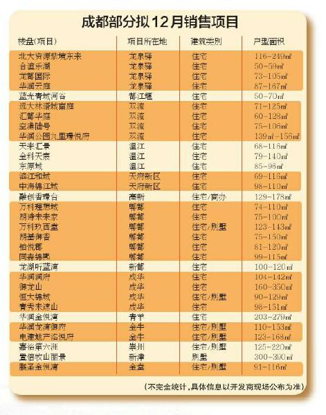 記者梳理龍泉驛、雙流、溫江、郫都、成華、青羊、金牛及都江堰、天府新區等地樓盤公開信息發現,包括華潤、萬科、恒大、融創、龍湖、置信、藍光、朗詩、嘉裕、東原、金科、中海等品牌開發商在內,12月份預計有32個項目、8000多套房源待售,其中別墅物業項目有7個,住宅物業25個,產品面積從最小戶型套二到大面積套四套五戶型皆有,剛需及改善購房者的選擇性范圍都比較大。某開發商營銷負責人告訴記者,目前公司正在等待相關部門落實具體的搖號選房操作辦法,一旦獲得預售證就將開盤。