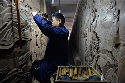 選擇木雕工匠時,專家團隊也四處比較,“一開始我推薦湖南衡陽的工匠,但比較之后發現,做工不如東陽木工那么細!鼻皫滋欤鬂h中再次來到工廠,參觀了主體工程已經完成的巨制,這些高浮雕作品,人物栩栩如生,一些人物的耳環還能夠拉動,這些細節讓他贊不絕口, “工匠們對白描畫進行了再創造,將自己的想法融入了進去!弊屪鬂h中感動的是,這些匠人在收到畫稿后,還會用電腦去搜索實物,“在雕刻木塔時,工匠們就通過照片來進行校正,對比之后,最終保證雕刻的質量”。