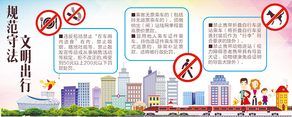 根據《條例》,規范乘客文明出行,營造良好乘車環境的要求還有更多,包括禁止吸煙、隨地吐痰、便溺、吐口香糖,亂扔果皮、紙屑、包裝物等廢棄物;禁止躺臥、乞討、收撿廢舊物品;禁止踩踏座椅、追逐打鬧、彈奏樂器;禁止擅自擺攤設點、停放車輛、堆放雜物、散發宣傳品或者從事銷售活動等。違反上述規定,拒不改正的,將受到50元以上200元以下罰款處罰。