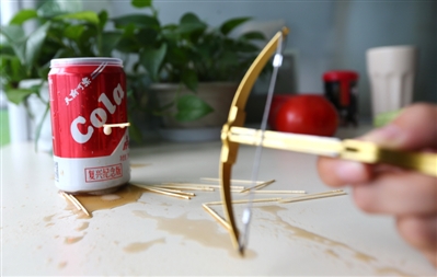 巴掌大小,以發射牙簽為主的牙簽弩,正在成都小學生中流行。射穿紙張易如反掌,刺入易拉罐不是難事,據網上試驗報道,牙簽弩配上鐵針,威力更大。