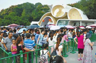 10月2日,成都大熊貓繁育研究基地門口排起長龍。有游客笑稱,熊貓基地已經變成人類基地了。 張磊攝