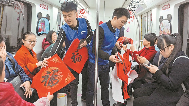 春節將至,成都地鐵3號線“盼達”號熊貓主題列車換上了“新衣裳”。1月24日,工作人員特意為乘客送上一份由地鐵職工書寫的新春對聯和大紅“福”字。