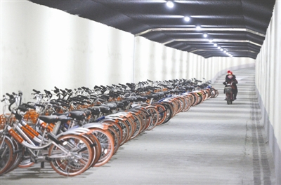 隧道內(nèi)停放了許多共享單車,因隧道無信號無法使用