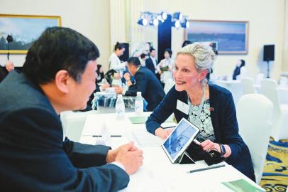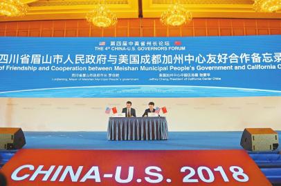 相聚 第四屆中美省州長論壇上,兩國各地嘉賓相聚成都。本版圖片由 本報記者 郝飛 攝 相約 眉山市政府與美國加州中心簽署友好合作備忘錄,相約共建眉山加州智慧小鎮(zhèn)。相談 中美企業(yè)代表洽談合作。