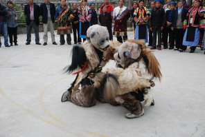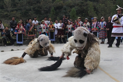 熊貓舞面具的造型是動物形象,仔細看它不像熊貓倒像熊,而且面目猙獰用以威嚇鬼怪,這與族人原始動物崇拜、圖騰崇拜有密切關系。這種圖騰崇拜的習俗,在今天,已經演繹成為一個重要的文化符號。