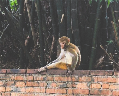 7月25日,網友通過新浪微博報料稱,周末他跟朋友去峨眉山避暑,在報國寺附近閑逛,想在周邊農家樂買土雞。走進其中一家農家樂的院子,看到一只猴子被鐵鏈拴住脖子,鎖在一個手推車上,“看起來非常可憐,誰來解救大師兄?”有網友表示,猴子是峨眉山上的“山大王”,這些頑皮又霸道的猴子,讓廣大游客又愛又怕,不曾想到,還有一只猴子落魄如斯!昂镒邮且吧鷦游铮瑧摷右员Wo,不能隨意飼養(yǎng)!庇芯W友呼吁景區(qū)相關部門盡快解救猴子。