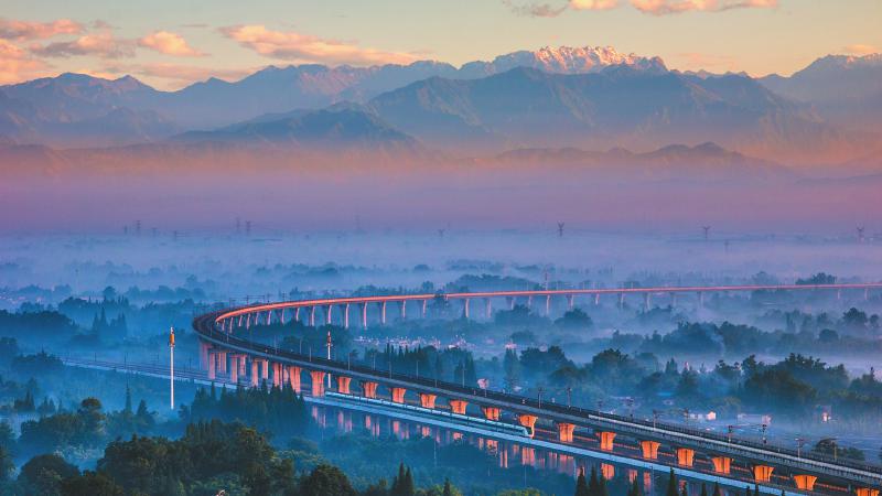當天,丘寒在成都郫都區一個樓頂上,拍下了當時所有從成都可以遙望到的雪山,并用軟件將27張照片合成了一幅超長全景畫卷。畫卷中,貢嘎山、大雪塘、四姑娘山幺妹峰、九頂山等10余座雪山一一呈現,在霞光之中,巍峨不動地矗立在成都城市的周邊,在網上引發熱議。