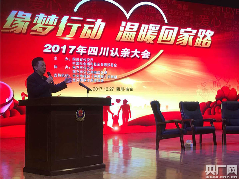央廣網成都12月27日消息(記者劉濤)12月27日上午,“緣夢行動,溫暖回家路”2017四川大型認親大會在南充順慶大禮堂舉行。7名被拐20多年的受害人,與家人得以團聚。