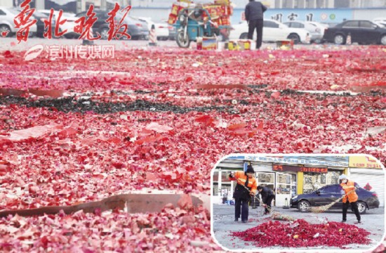 2月2日,是大年初六,不少商家都會按照習俗燃放“開門”鞭炮,隨之而來的一地鞭炮皮成了令環衛工人頭疼的“紅色垃圾”。自大年初二開始,濱州市城管執法局環衛處每天清理出的街道垃圾有三分之一是鞭炮皮。