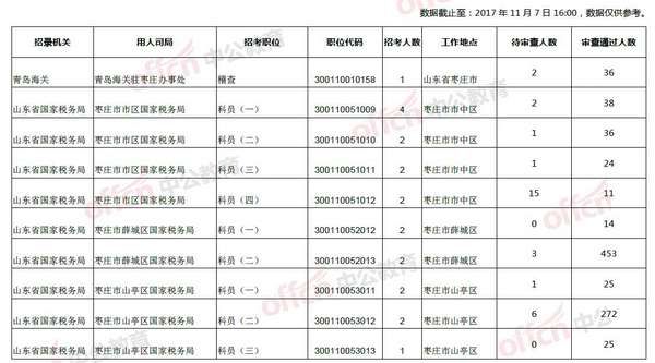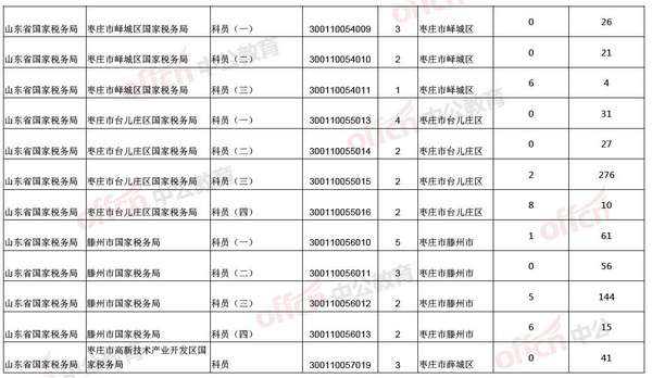 此次“國考”涉及棗莊的崗位有32個,共招錄63人。截至7日16時,涉棗崗位中報名人數最多的是棗莊市薛城區國家稅務局科員(二)崗位,報名人數達456人。該崗位要求學歷為本科及以上,不限基層工作最低年限、政治面貌,也不僅限應屆高校畢業生報考,故吸引的報考人員較多。