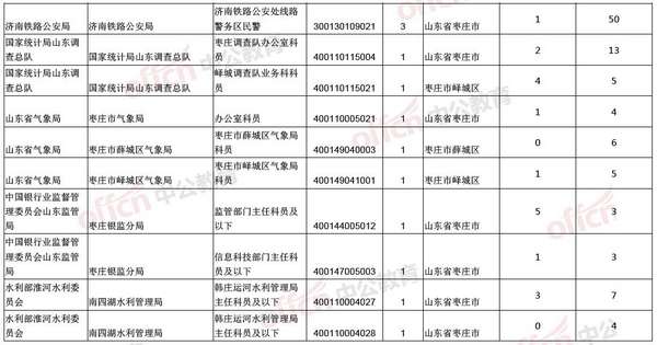 報名人數最少的是棗莊銀監分局信息科技部門主任科員及以下崗和南四湖水利管理局韓莊運河水利管理局主任科員及以下崗(法學專業),報考人數均為4人。