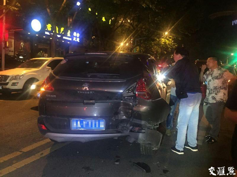 被追尾的前三輛車都不同程度受損。尤其第一輛標致轎車里三名乘客頭部不適被120送醫院治療。賓利車頭受損漏水漏油。