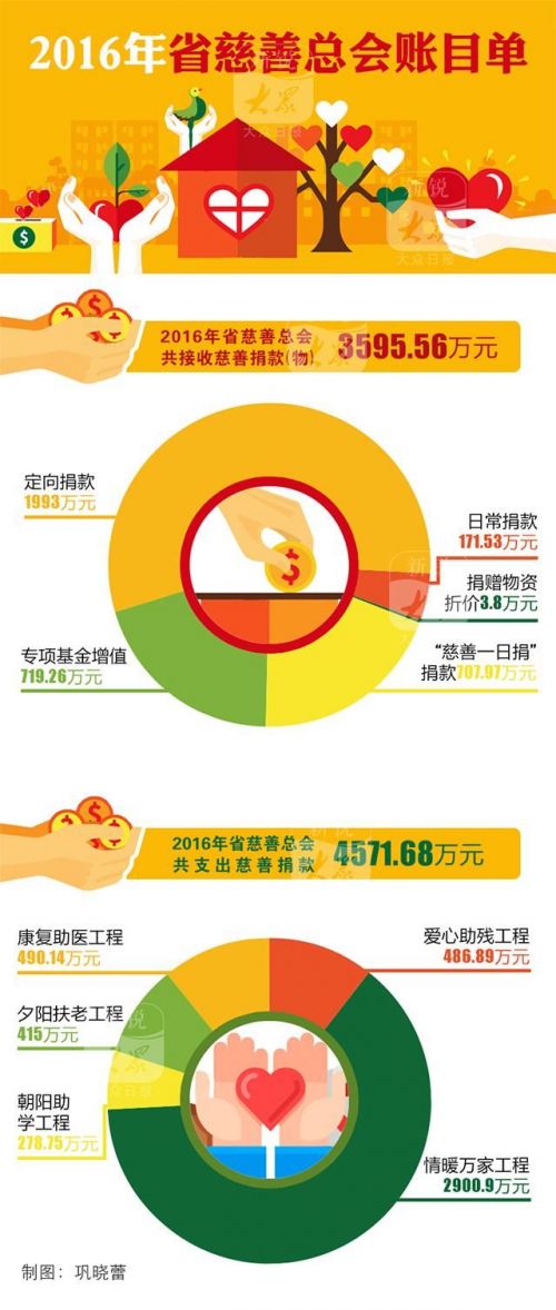 2016年山東省慈善總會共支出慈善捐款4571.68萬元,占上年可支配善款90.19%。其中,(一)朝陽助學工程支出278.75萬元,包括向在校特困大學生支付救助款26.9萬元;向父母外出打工且家庭貧困的留守兒童支付項目款101.85萬元;山東移動獎學金定向助學款70萬元;利群陽光、偉東置業等開展的定向助學款80萬元。(二)夕陽扶老工程支出415萬元,包括貧困老年性白內障患者救助項目手術款100萬元;為全省農村敬老院、幸福苑支付夕陽溫暖工程項目款315萬元。(三)康復助醫工程支出490.14萬元,包括支付先心病項目救助款66.99萬元;支付貧困尿毒癥患者親體腎移植項目捐款224萬元;支付貧困尿毒癥患者血液透析項目救助款199.15萬元。(四)愛心助殘工程支出486.89萬元,包括向貧困殘疾人支付康復訓練及診療費212.6萬元;支付貧困唇腭裂患者救助項目手術費260.66萬元;支付中華慈善總會—美國LDS慈善協會輪椅項目款9.63萬元;支付定向救助貧困演技患者診療費4萬元。(五)情暖萬家工程支出2900.9萬元,包括全省特困企業職工家庭救助款1348.7萬元;特困省直機關職工救助237.5萬元;特困軍人家庭救助款38萬元;特困檢察人員家庭救助款100萬元;特困公安英烈家庭救助款100萬元;特困銀行業職工家庭救助款170萬元;特困群眾生活救助款601.74萬元;定向扶貧救助款304.96萬元。