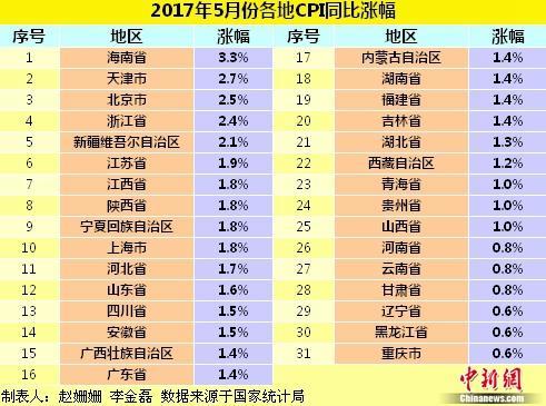 數據顯示,海南5月份CPI同比漲幅為3.3%,漲幅全國最高,也是5月份全國僅有的CPI漲幅進入“3時代”的地區。