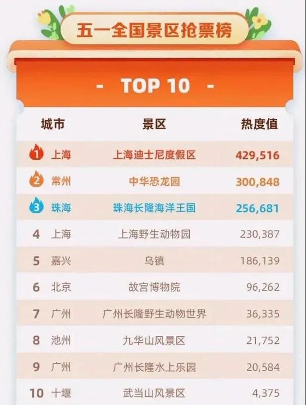 節日期間,環球恐龍城旅游度假區迎來了全國各地43.7萬游客,其中,中華恐龍園景區位列飛豬旅行“五一全國景區搶票榜”第二,并榮登驢媽媽《2021五一出游總結報告》“全國熱門景區TOP10”和“華東熱門景區TOP10”雙榜。
