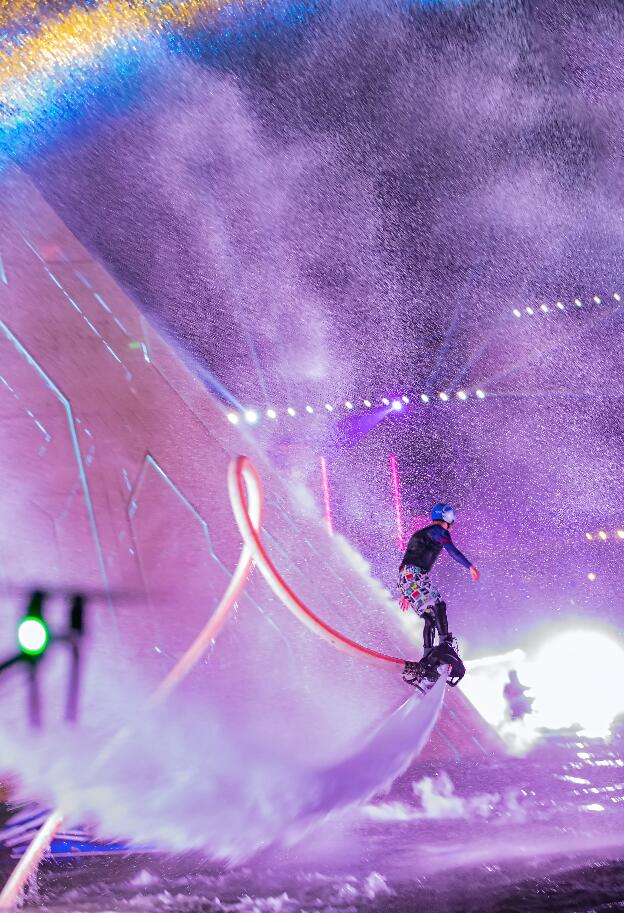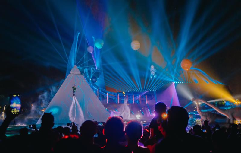 為打造全方位的沉浸式效果,《D秀》團隊歷時一年多的技術研發,以數字多媒體聲光演藝為主要手段,以中華恐龍館為核心,對周圍的空間格局、觀演環境等進行了全方位的考量。在精心挑選的位置上新增了數百個全新的燈光效果裝置,力求從觀眾入場開始,就能夠根據故事節奏設置,營造不同的現場氛圍,并能夠配合劇情發展,帶來進一步升級的觀賞感受。其中,為《D秀》特別定制的水中升降三維立體數字光影裝置也震撼亮相,成為了此次大秀的點睛之筆。