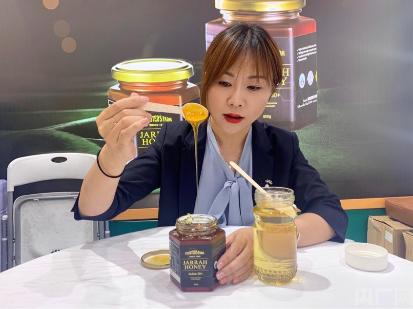 在國際食品和飲料主題館,記者看到洋妝源總裁助理張鳳怡正在以濃稠度、香味、色澤為標準,將西澳菲斯特農(nóng)場赤桉蜂蜜與市面上的一款普通蜂蜜進行對比。