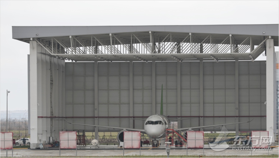 近日,為確保C919大型客機首飛成功,對C919設計結果、制造狀態、試飛和客服工程準備工作進行確認,中國商用飛機有限責任公司在上海組織召開了C919首飛技術評審會。評審委員會一致同意通過C919首飛技術評審。同時,建議在完成電磁兼容等試驗及滑行試驗驗證后可提請首飛放飛評審,這標志著C919向著首飛目標又邁出了堅實的一步。圖為:中國國產大飛機c919正在上海浦東機場機庫中調試。