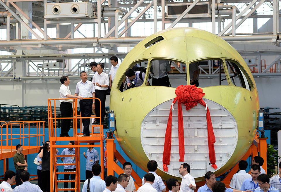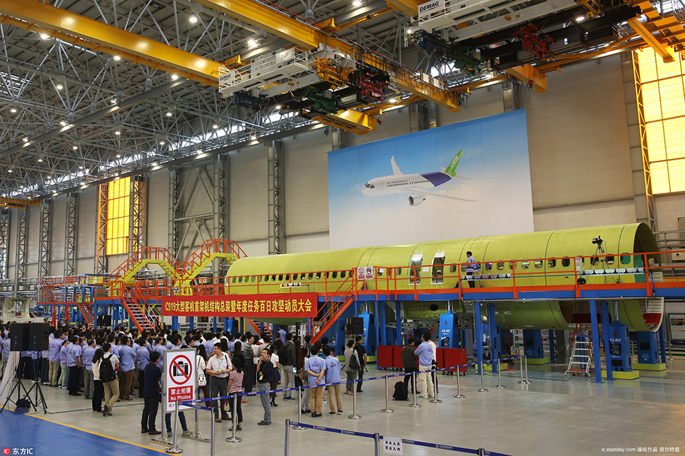 2014年9月19日,上海,中國商飛公司研制的C919國產大型客機前機身與中機身的對合標志著C919拉開了總裝序幕。