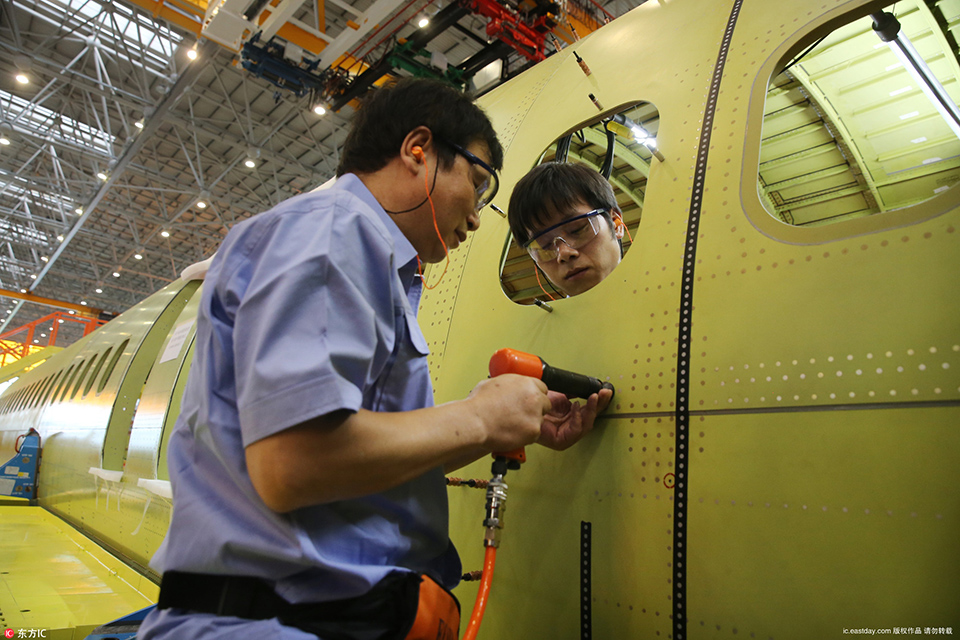 2014年9月19日,上海,中國商飛公司研制的C919國產大型客機前機身與中機身的對合標志著C919拉開了總裝序幕。 中國商飛上海浦東總裝基地于2011年5月開始建設,現已投入使用,到2020年將具備150架C919大型客機和50架ARJ21新支線飛機的年批產能力。