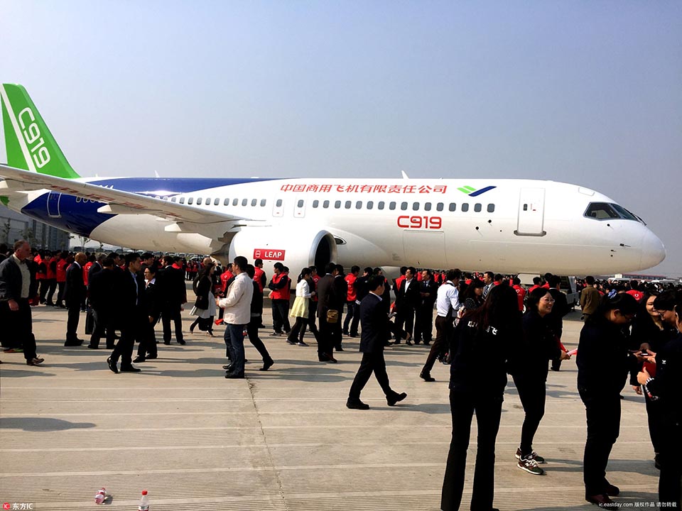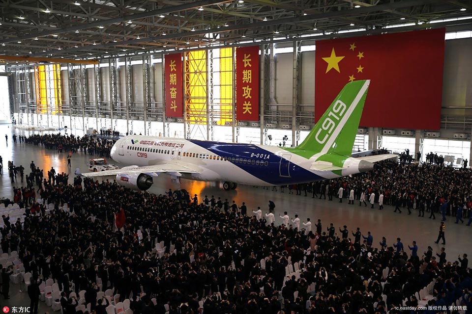 2015年11月2日上午,在中國商飛公司新建成的總裝制造中心浦東基地廠房內,隨著兩扇帷幕緩緩拉開,一架帶有“商飛藍”和“商飛綠”涂裝的新型商用飛機完整地展現在世人面前,這正是我國自主研制的C919大型客機。圖為下線儀式現場。