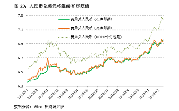 該報(bào)告預(yù)測:由于人民幣的定價(jià)機(jī)制已經(jīng)發(fā)生改變,2017年人民幣的走勢更多的要看外圍貨幣對(duì)美元的表現(xiàn)。鑒于經(jīng)濟(jì)增長前景方向不同,以及美國加息頻率可能加快,人民幣兌美元在2017年仍會(huì)延續(xù)下跌,但兌其他貨幣則將相對(duì)保持穩(wěn)定。